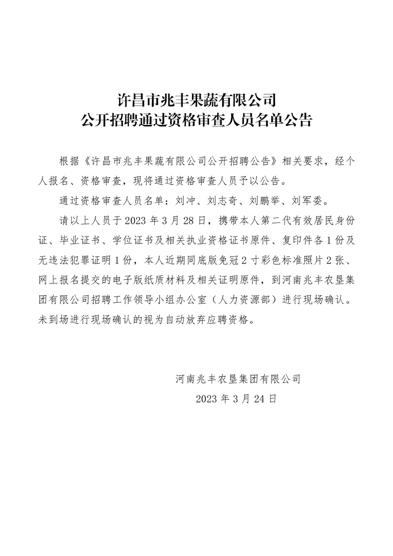 · 許昌市兆豐果蔬有限公司 公開招聘通過資格審查人員名單公告