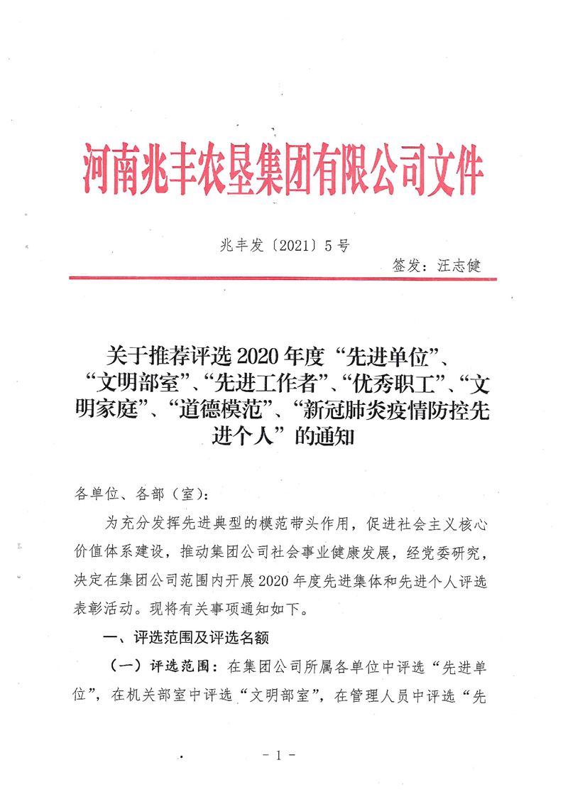 · 河南兆豐農(nóng)墾集團(tuán)有限公司 關(guān)于推薦2020年度“先進(jìn)單位”、“文明部室”、“先進(jìn)工作者”、“優(yōu)秀職工”、“文明家庭”、“道德模范”、“新冠疫情防控先進(jìn)個(gè)人”的通知
