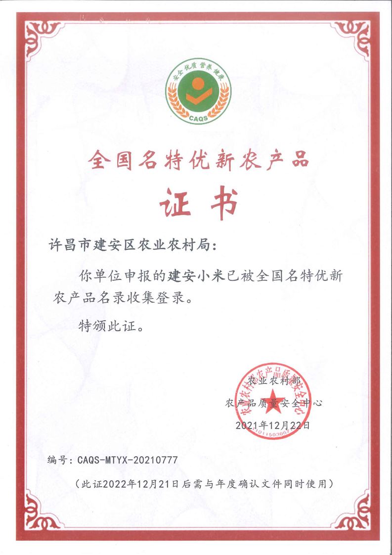 · 祝賀河南兆豐農(nóng)墾集團有限公司 申報的“建安小米”被全國名特優(yōu)新農(nóng)產(chǎn)品名錄收集登錄