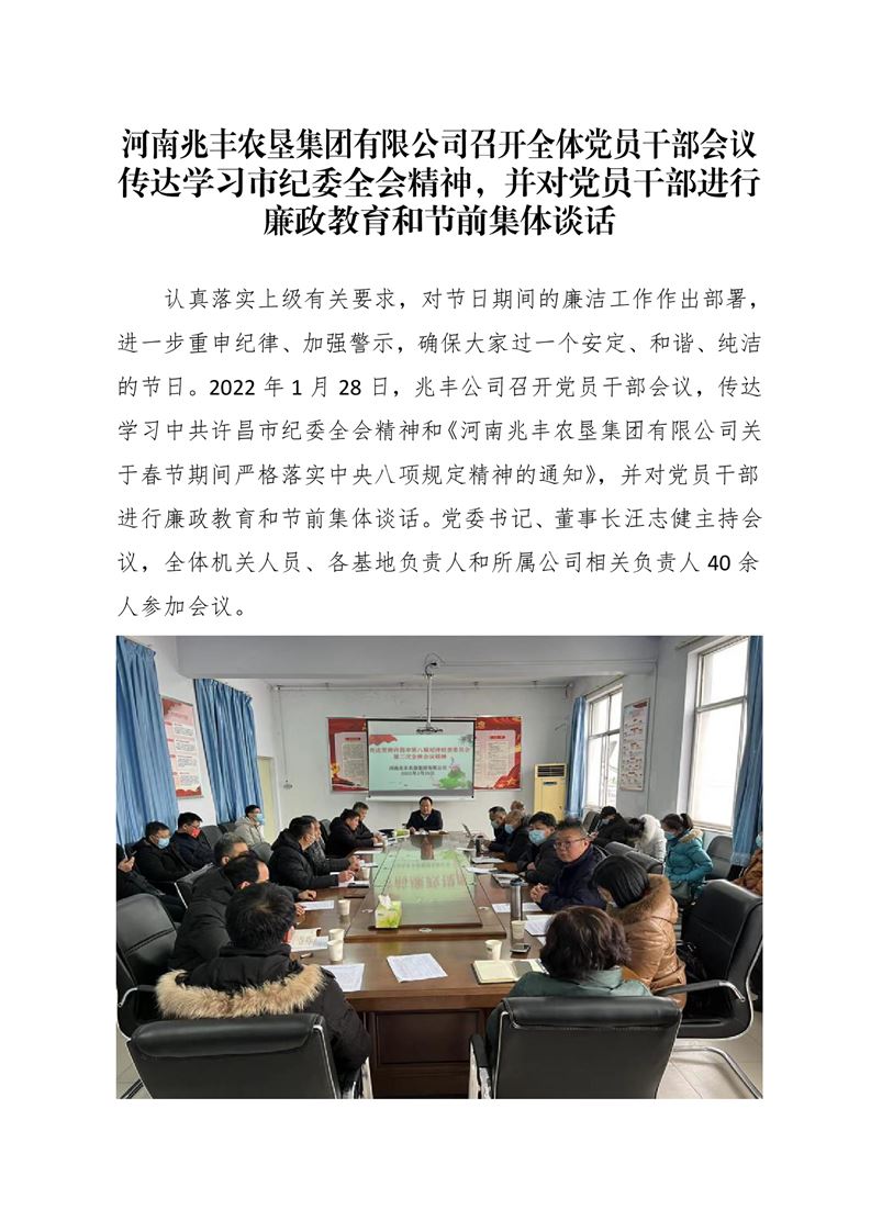 · 河南兆豐農(nóng)墾集團(tuán)有限公司 召開(kāi)全體黨員干部會(huì)議傳達(dá)學(xué)習(xí)市紀(jì)委全會(huì)精神,并對(duì)黨員干部進(jìn)行廉政教育和節(jié)前集體談話